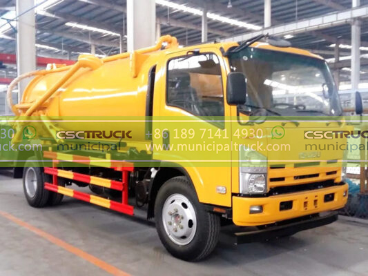 ISUZU 8 Ton Sewage Vacuum Truck is consists of a large tank for storing liquids, a strong pump for vacuuming and a series of hoses, collecting and transporting hazardous and nonhazardous liquid and semi-liquid waste. The truck is cost effective and good performance in short distance transportation. The KV600 chassis is provided with ISUZU 4KH1-TCG40 engine. And the power of engine is 96Kw,displacement is 2999ml,horsepower is 130hp, and transmission is Manual MSB-5SM, front seat have 3 seats,and the rear axle ratio is 5.375.